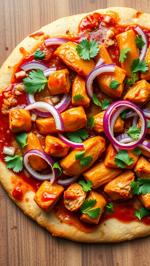 To make this dish, gather some shredded chicken, BBQ sauce, red onions, and cilantro. Preheat the oven, spread the sauce on the crust, and top it off with your ingredients. Bake until bubbly and golden. For the full recipe, check out this BBQ Chicken Pizza guide. It’s a great way to create lasting memories in the kitchen with your family!