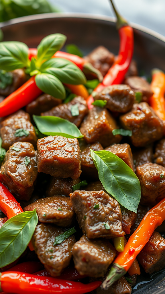 This Thai Basil Chicken Stir Fry is a vibrant dish that pops with colors and flavors. The image showcases juicy pieces of chicken, bright green basil leaves, and fiery red chili peppers. Each ingredient plays a role in creating a meal that’s both fresh and satisfying.