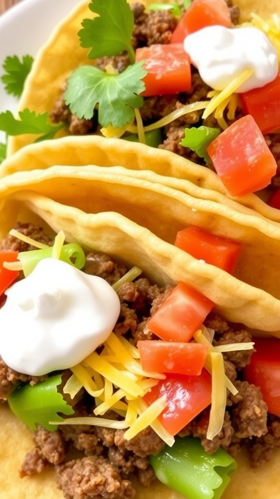Beef tacos are a classic dish that many love for their delicious flavors and satisfying crunch. The image captures a plate of fresh tacos, filled with seasoned ground beef and topped with vibrant ingredients.