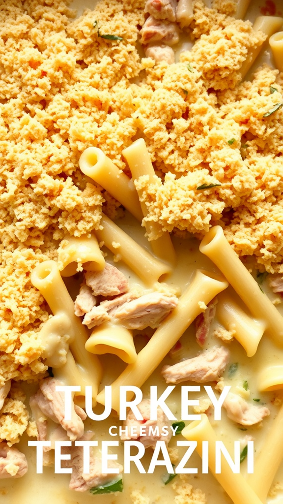 In the image, you can see the pasta intertwined with chunks of turkey, all topped with a golden, crumbly layer. The textures are inviting, hinting at the creamy goodness hidden beneath. This dish is perfect for using up leftover turkey, making it an economical choice for any weeknight dinner.