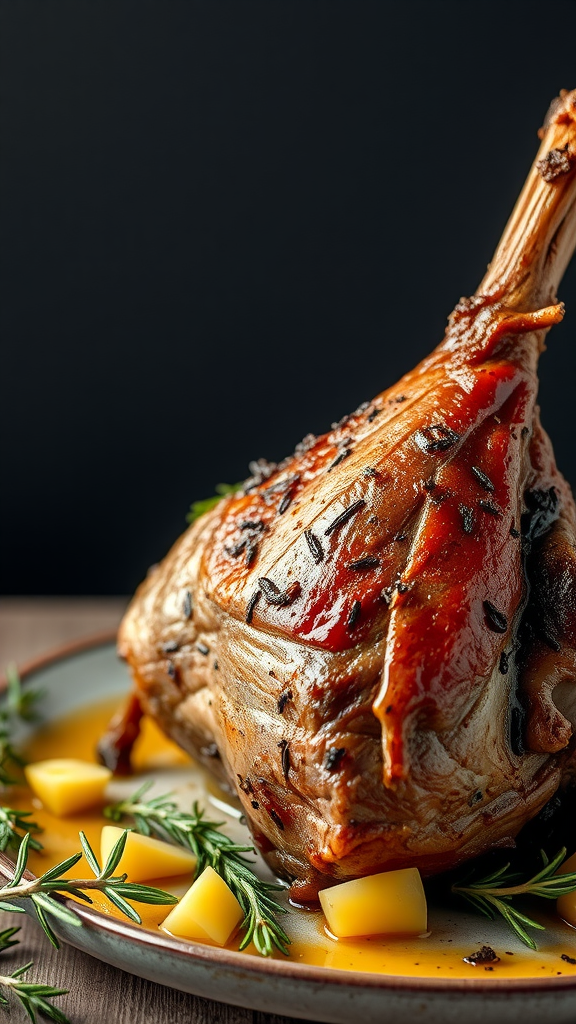 Making roasted leg of lamb is simpler than it appears. You can season it with fresh herbs like rosemary and thyme, which you can see garnishing the plate. Pair it with roasted vegetables or a light salad to complete the meal. The flavors meld beautifully, making every bite a treat.