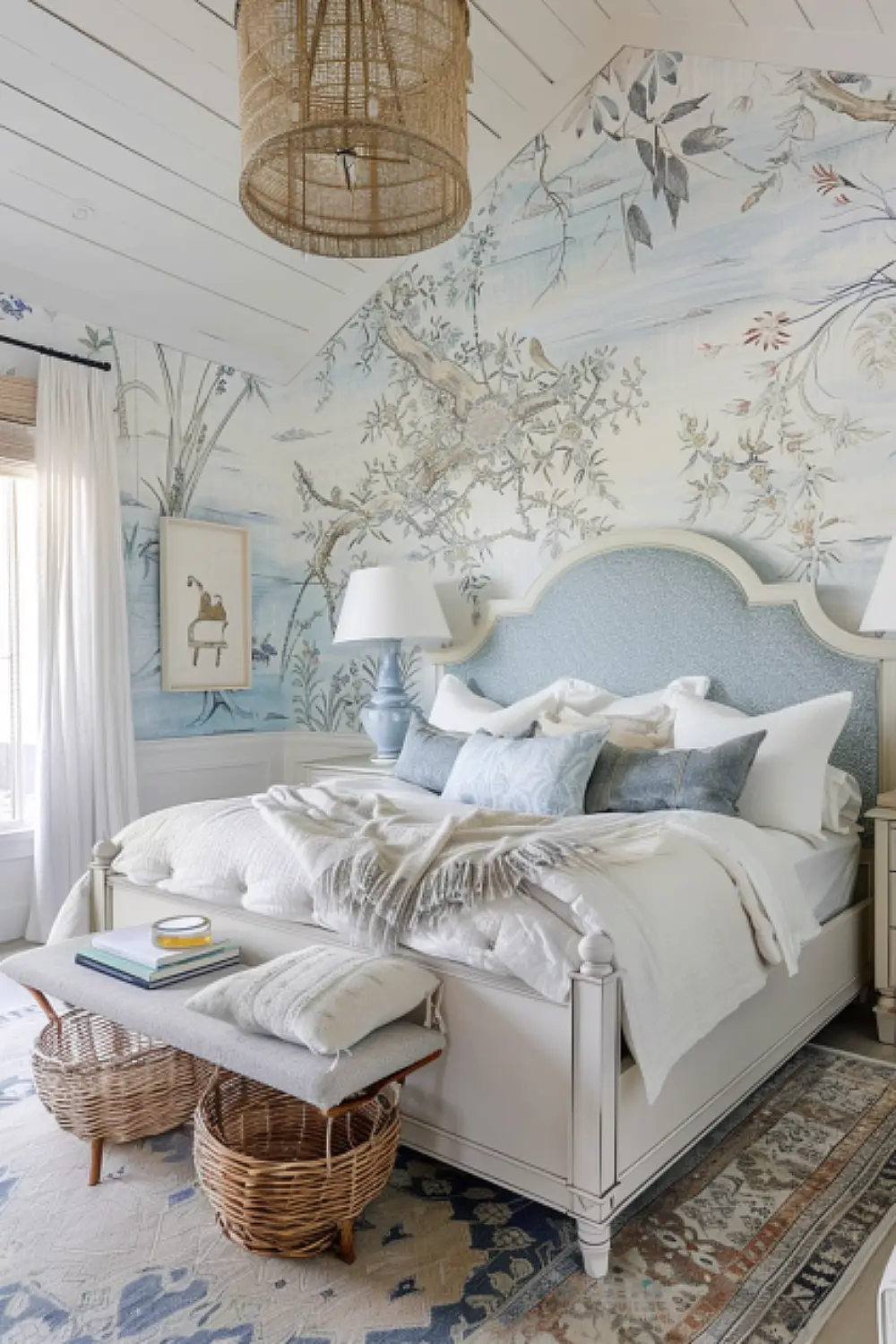 Bring the beach indoors with coastal-themed wallpaper. Light blues and sandy tones evoke a relaxed, beachy feel that’s perfect for a serene boho space.