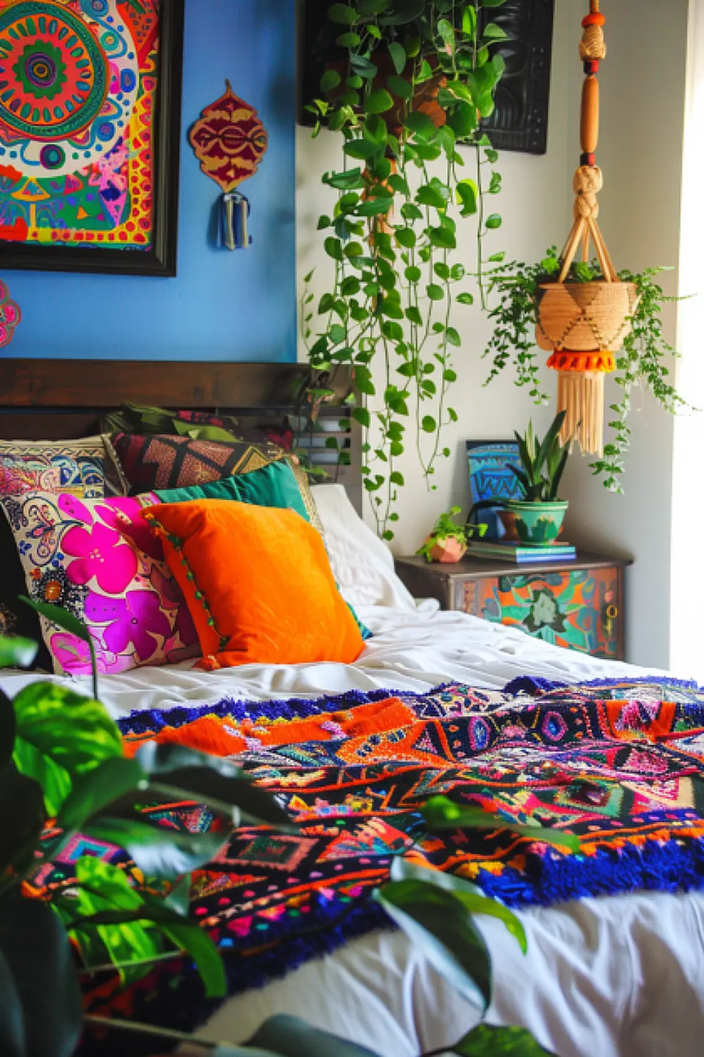 Mix and match eclectic pots and hanging planters in vibrant colors for a playful look in your Boho bedroom. This vibrant approach brings personality and life to any room.
