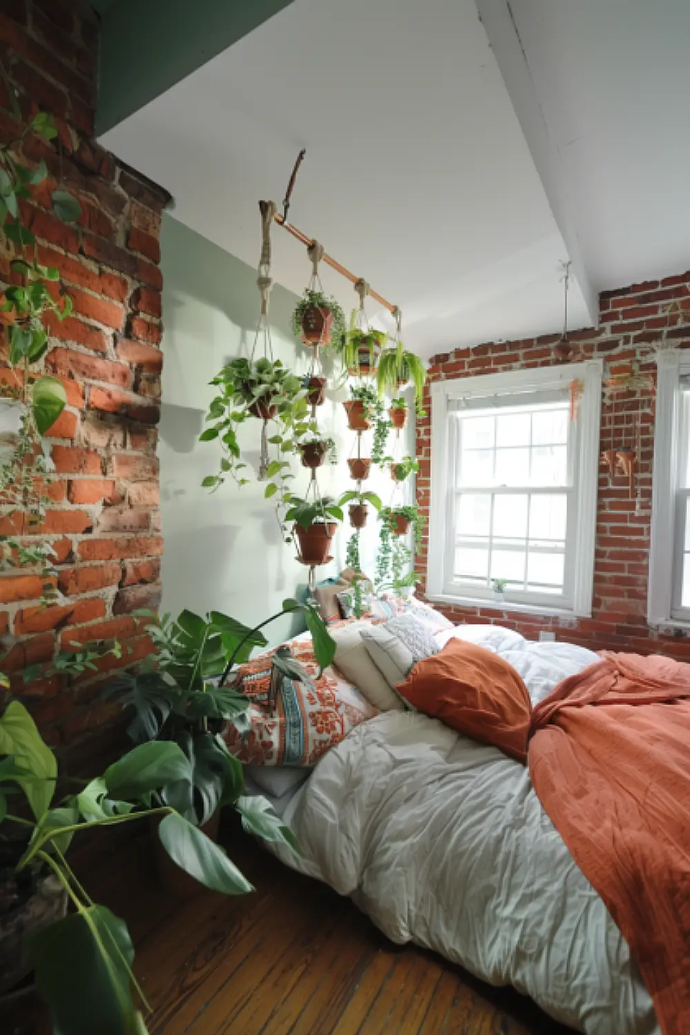 Hang plants over your bed to create a dreamy, natural canopy. Use light fabrics and soft colors to complement the greenery. This serene setup is perfect for relaxation.
