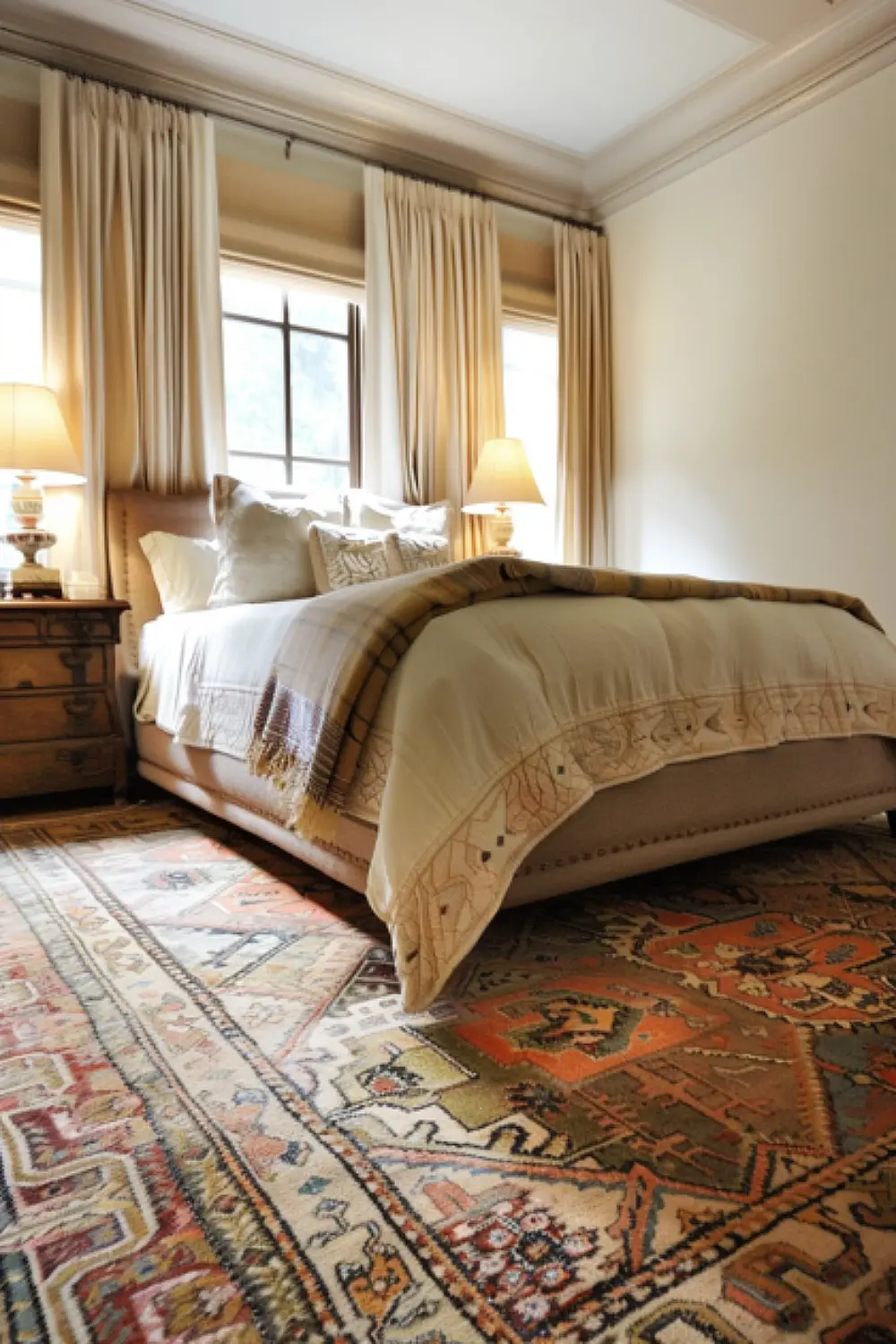 For those who love to stand out, an eclectic rug with vibrant colors and unique patterns is the way to go. It’s a statement piece that can tie together a variety of decor styles, making your bedroom a showcase of your personal style. Let your rug be the centerpiece of your eclectic haven.
