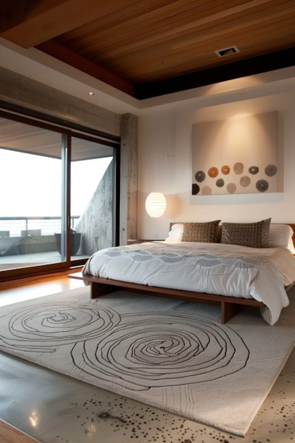 A monochrome rug doesn’t have to be boring. In a minimalist bedroom, it can add depth and interest, especially when paired with modern furnishings. Black and white patterns can be bold or subtle, but they always make a statement. This is a great way to keep things simple yet stylish.