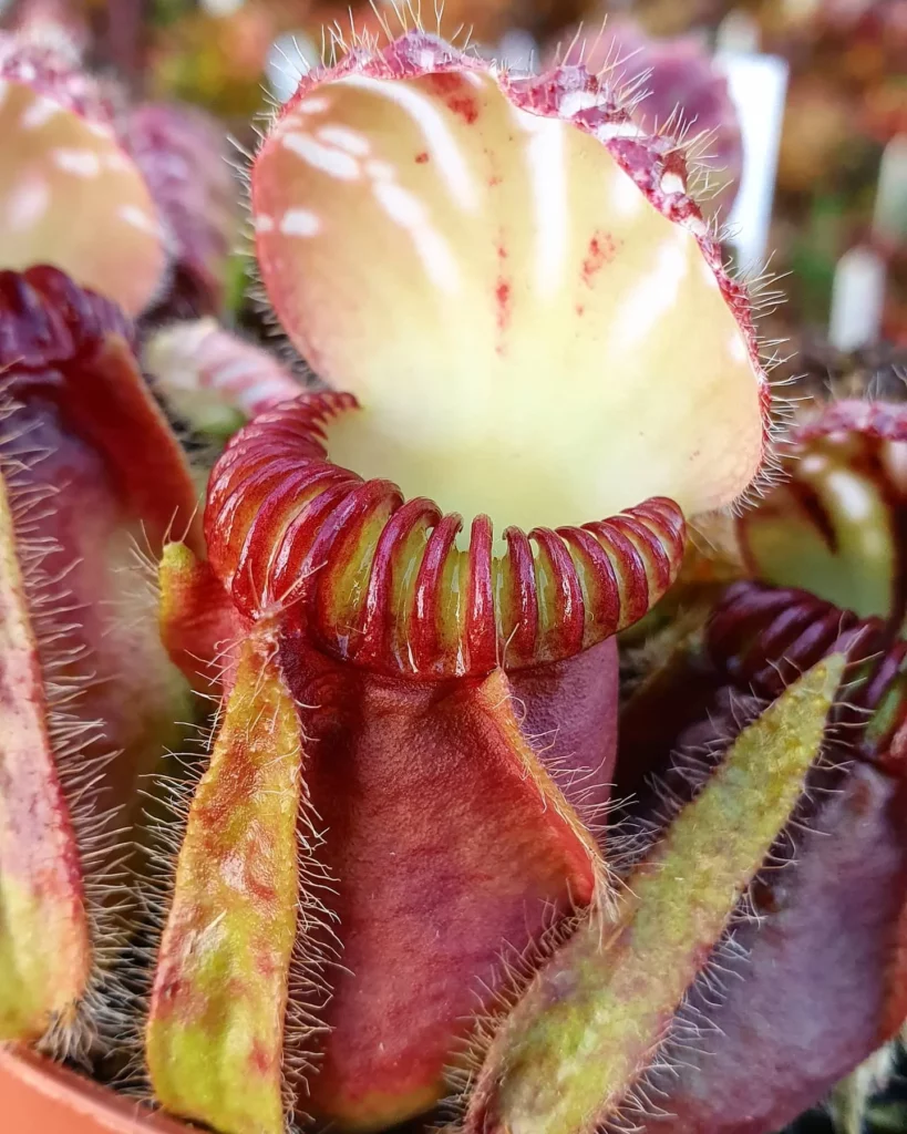 The Albany Pitcher Plant, scientifically known as Cephalotus follicularis, is a ground-hugging carnivorous plant that produces small clumps of colorful thumb-size pitchers. The pitchers can range in color from orangey-reds to maroons, and even almost black. They have a line of “teeth” lining the rim.