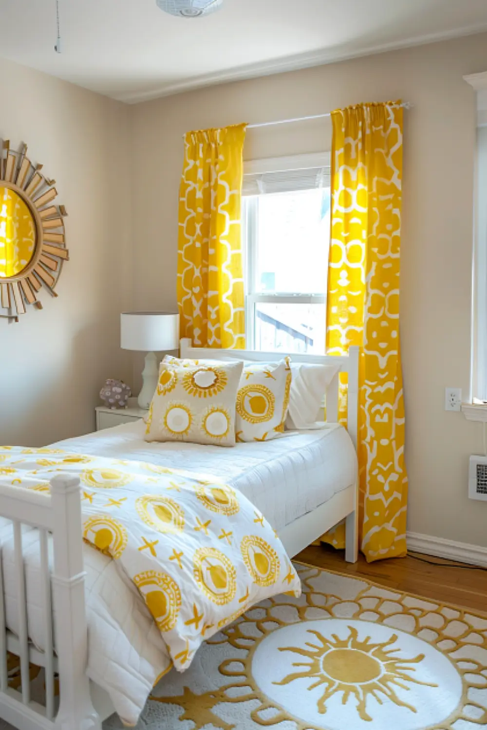 Brighten her world with a sunshine sanctuary theme featuring sun motifs, bright yellow curtains, and a sun-shaped mirror.