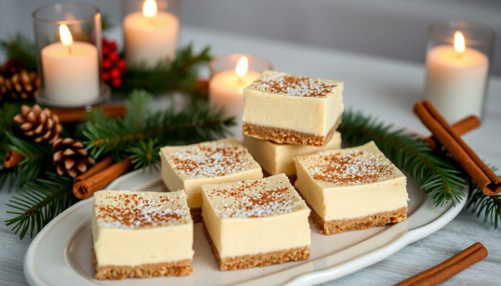 As the holiday season comes near, think about the fun of baking and sharing sweet treats. Eggnog cheesecake bars are a perfect holiday treat. They mix creamy cheesecake with eggnog and nutmeg flavors.