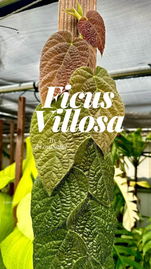 Ficus villosa is a type of fig tree that is known for its distinctive fuzzy leaves and ability to climb. Its leaves are covered in soft, velvety hairs, giving them a unique texture and appearance.