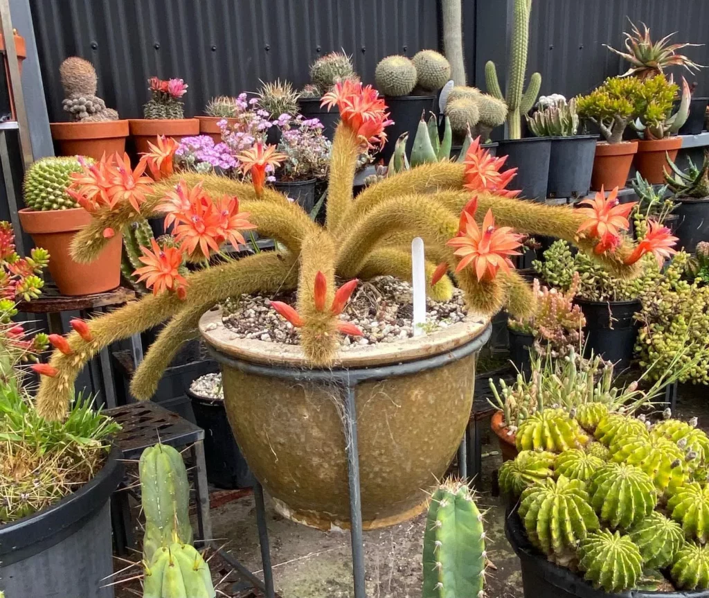 When it comes to flowering, the Golden Rat Tail does not disappoint. When in bloom, it showcases vibrant orange or salmon-pink flowers, providing a burst of color amidst its golden spines and coiled stems. These blooms are a delightful contrast against the backdrop of the cactus and add an extra layer of charm to this remarkable plant.