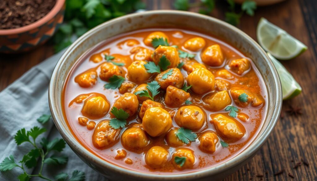 Imagine a mix of chickpeas, spices, and herbs that takes you to India’s busy streets. This is chana masala, a favorite vegetarian dish loved by many. It’s perfect for both Indian food lovers and newcomers, offering a true taste of India.