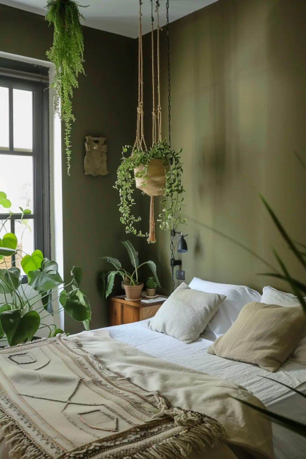 Fill your bedroom with hanging plants against olive green walls to create a lush, plant-filled paradise. This green sanctuary is perfect for bringing the outdoors inside and works well with natural wood furniture.