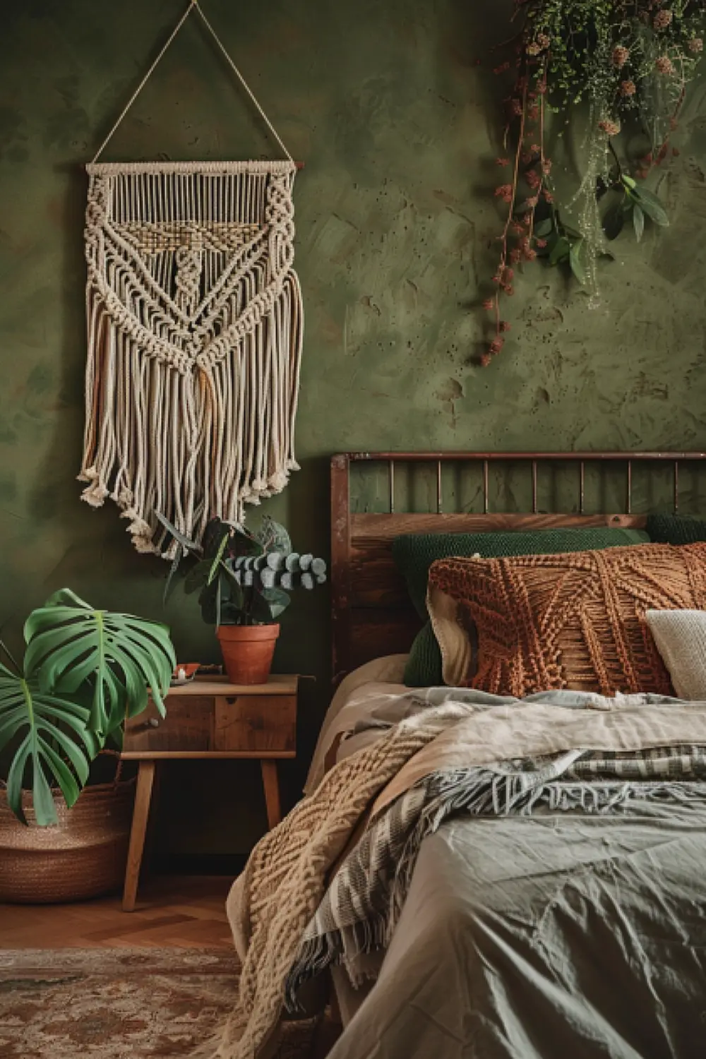 Try your hand at DIY boho decor like homemade macrame pieces complemented by olive green pillows. This personalized touch adds uniqueness to your space and can be a fun project.