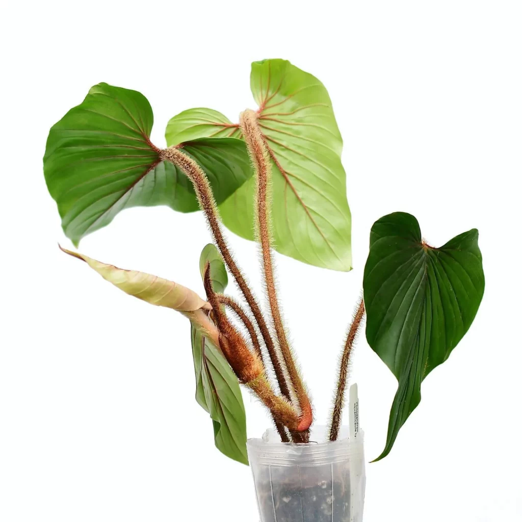 Philodendron Squamicaule can grow up to 30 cm in length. Its petioles are one of the distinguishing features of the plant, with a scaly or hairy appearance in reddish color. The leaves are large, heart-shaped, and have striking reddish lateral veins, adding to the dramatic look of the plant. With proper care, Philodendron Squamicaule can grow and develop into a lush and healthy indoor foliage.