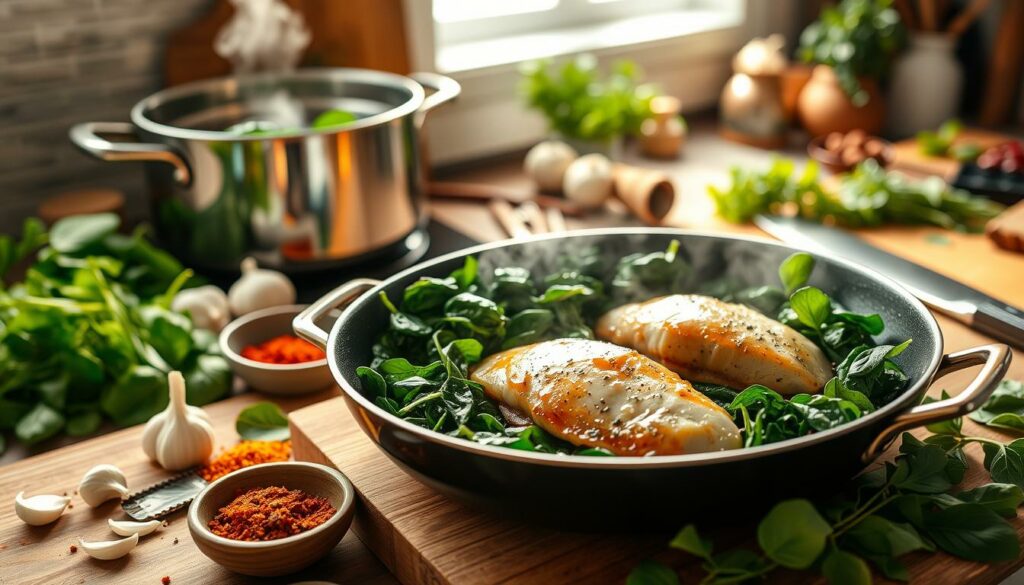 This recipe mixes tender chicken with fresh spinach. It makes a meal that’s good for you. It’s also great because you can change it to fit your taste.