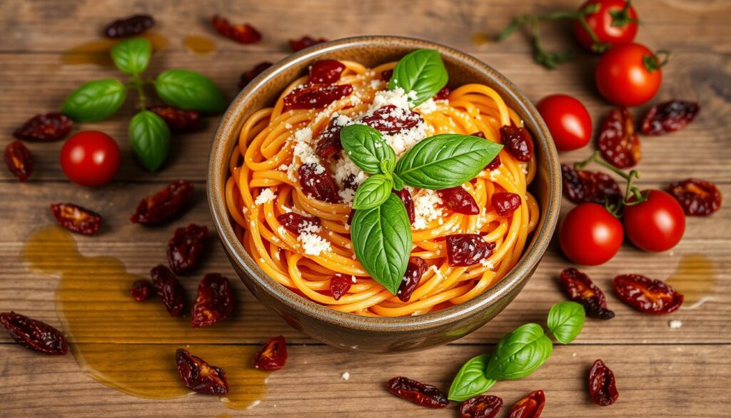 - It combines the rich, concentrated flavors of sun-dried tomatoes with perfectly cooked pasta