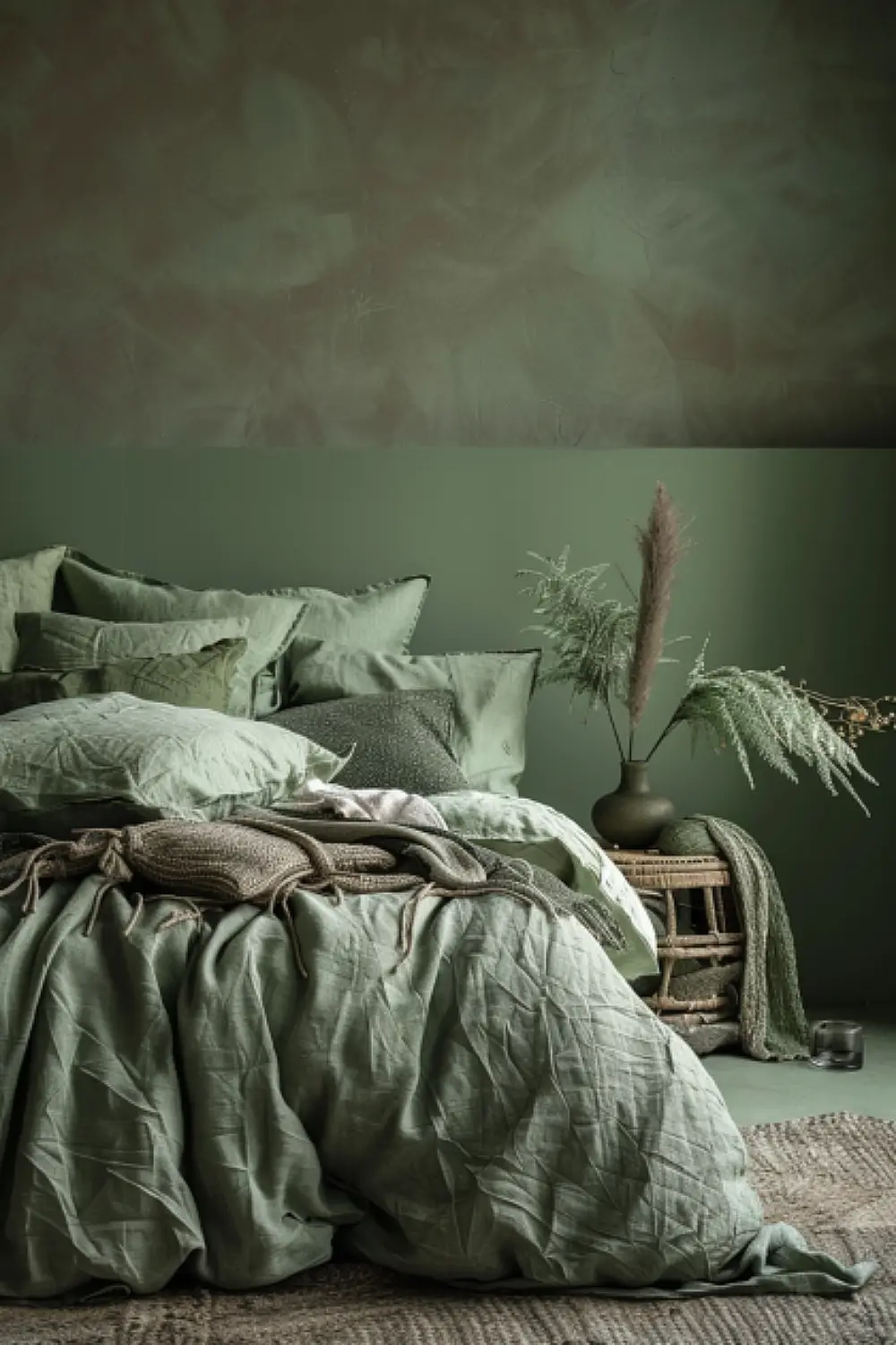 Opt for textured bedding in soft earth tones to complement your green boho style bedroom. Layers of fabric add comfort and a casual, laid-back vibe. Perfect for a stylish, inviting bed setup.