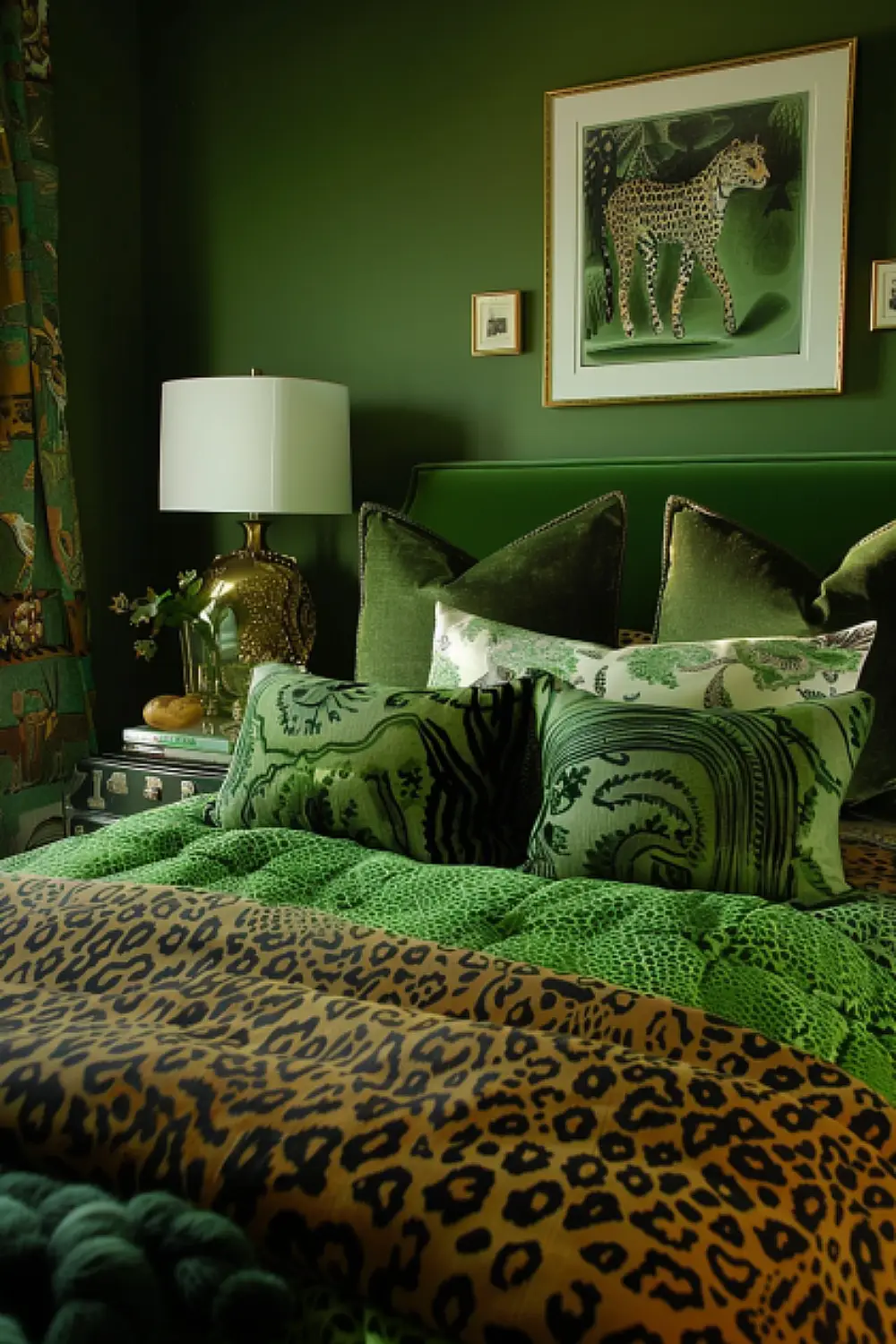 Introduce exotic animal prints through accent pillows or a small area rug. This adds a bold, adventurous element to your green boho bedroom.
