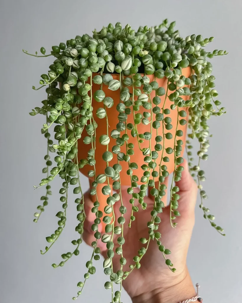 String of Pearls, or Senecio rowleyanus, is a unique trailing succulent with small, round, bead-like leaves. This plant is perfect for hanging baskets or as a trailing element in mixed containers. It adds a whimsical and elegant touch to indoor spaces.